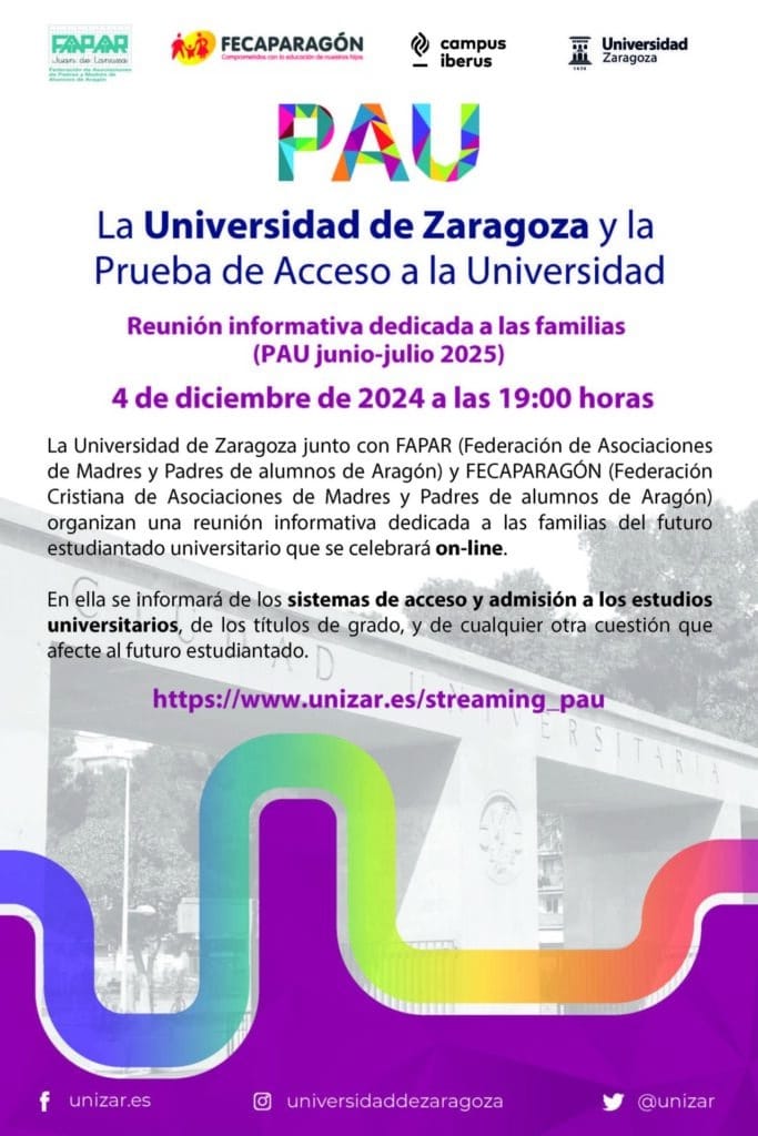 Tal y como estamos haciendo estos últimos años y junto con la Universidad de Zaragoza os invitamos a participar de forma online por streaming, a la sesión informativa del sistema de admisión a los estudios universitarios PAU o lo que anteriormente se llamaba EVAU.